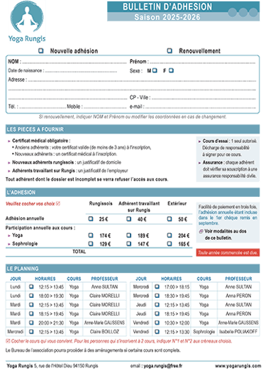 L’adhésion à Yoga Rungis est obligatoire pour participer aux activités directement organisées par l’association.
