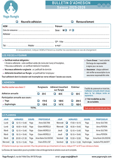 •Photo d’identité (possibilité d’envoyer par mail à yoga.rungis@free.fr une photo au format électronique).