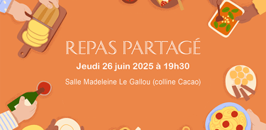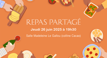 Venez célébrer dignement la première année de l'association autour d'un repas partagé le jeudi 26 juin à 19h30 dans la salle Madeleine Le Gallou (colline Cacao).